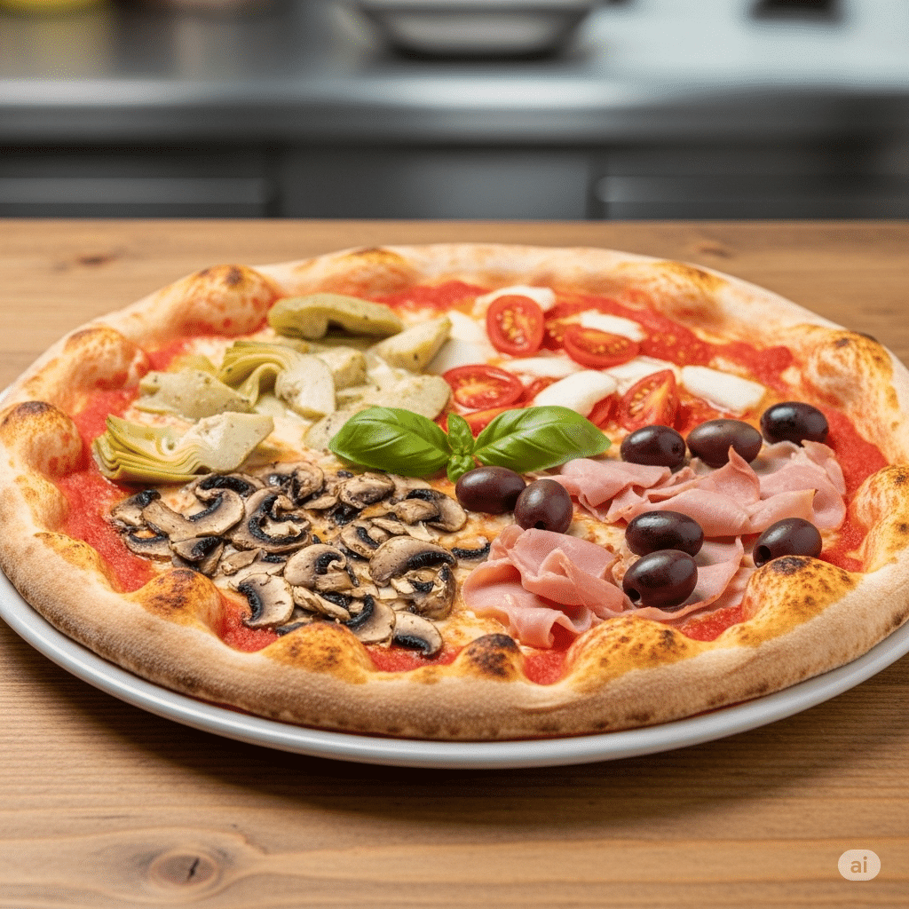 Molho de tomate artesanal, mussarela derretida e uma seleção em quatro partes: Alcachofra – delicada e saborosa, representando a primavera. Presunto – suave e marcante, remetendo ao verão. Cogumelos – salteados e aromáticos, trazendo o outono. Azeitonas pretas – intensas e robustas, celebrando o inverno. Uma pizza clássica italiana, dividida em quatro sabores que juntos criam uma experiência completa.