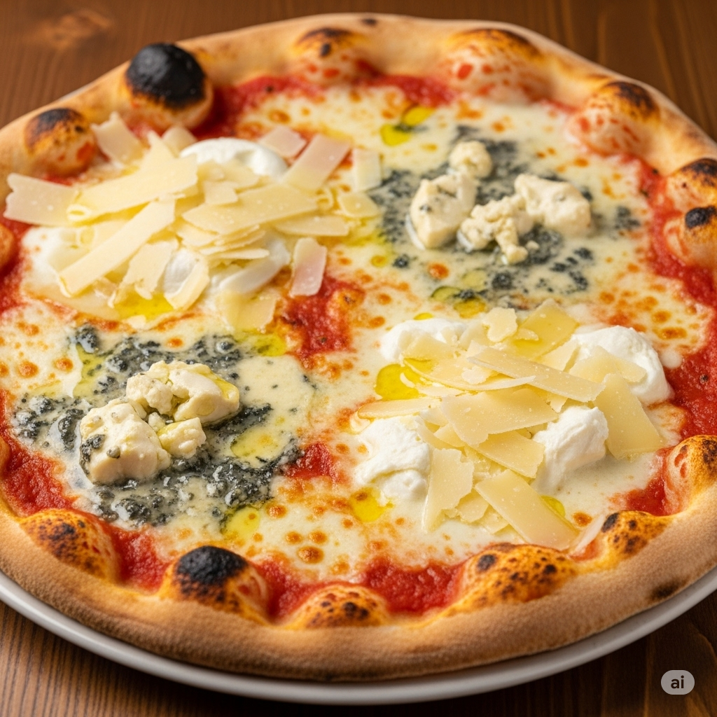 Base de molho de tomate artesanal e a harmonia perfeita de quatro queijos selecionados: mussarela cremosa, gorgonzola marcante, parmesão curado e provolone defumado. Uma explosão de sabores e texturas para os apaixonados por queijo.